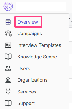The Overview section (Overview) is the central dashboard for viewing, searching, and managing all interviews related to your organization.