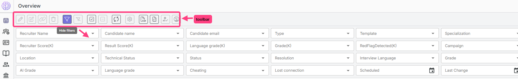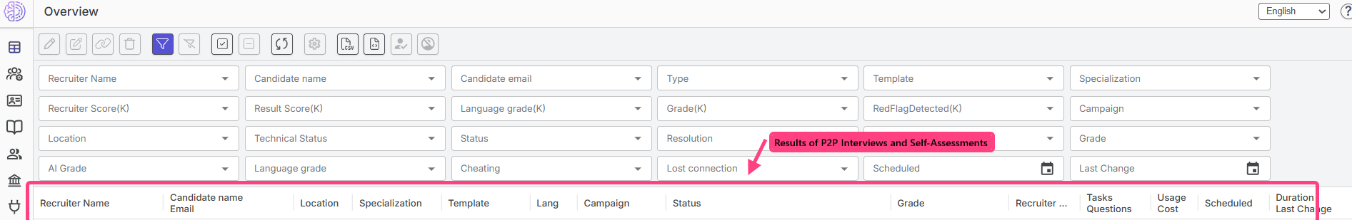| Find interviews with suspected cheating | Pay attention to the red icons in the Cheating column. |