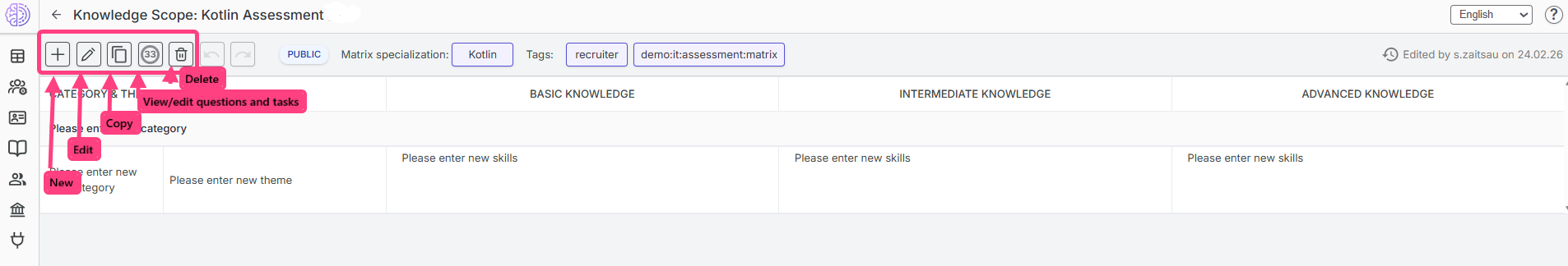 The Knowledge Matrices (Knowledge Scope) section is intended for creating and managing reference competency matrices. A matrix defines the topic structure, skills, and evaluation criteria for a specific specialization and is used as the basis for generating questions in interview templates.