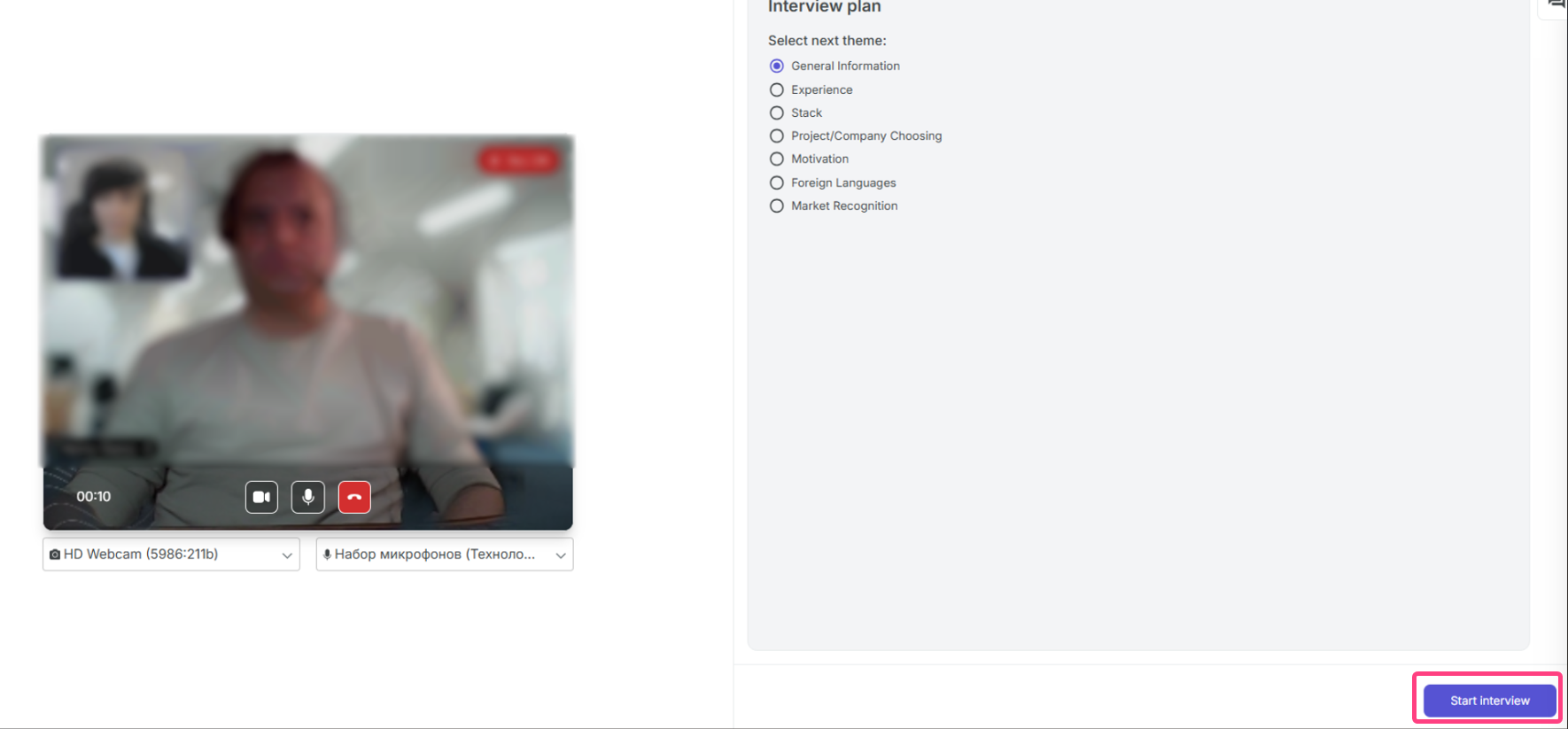 After the interview starts, an interface with the Interview plan will open. It contains discussion topics such as General Information, Experience, Motivation, and others. Topics can be covered in any convenient order and marked as completed as you go.