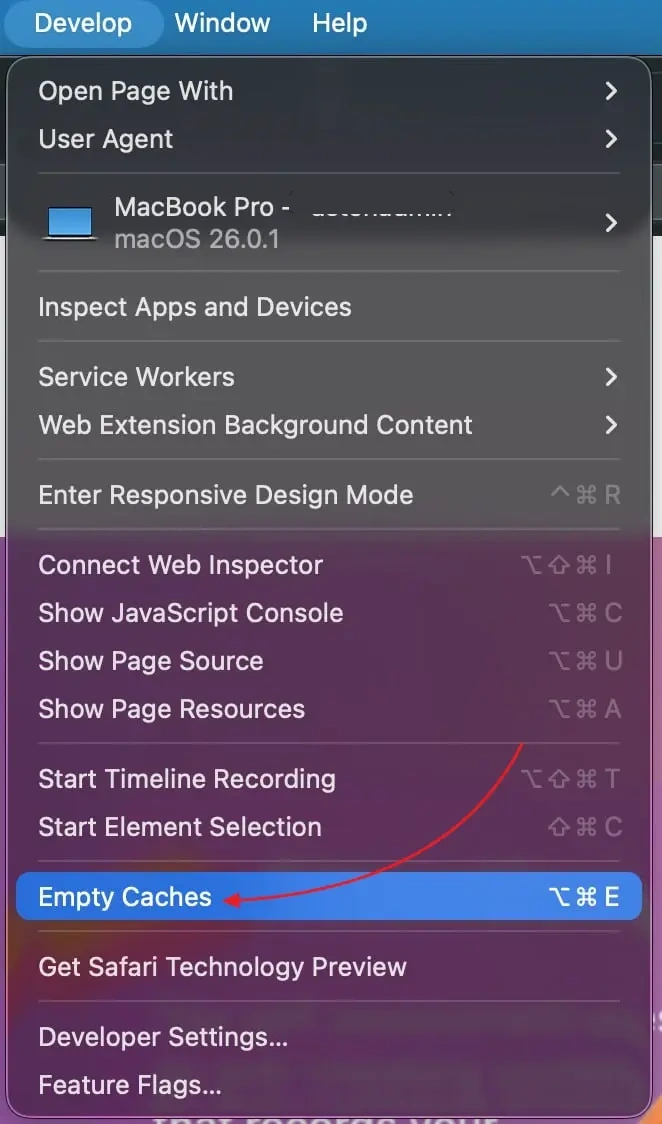 Command + Option + Eand Safari will clear the cache. If the command does not work, enable theDevelopmenu as described in option 2.
