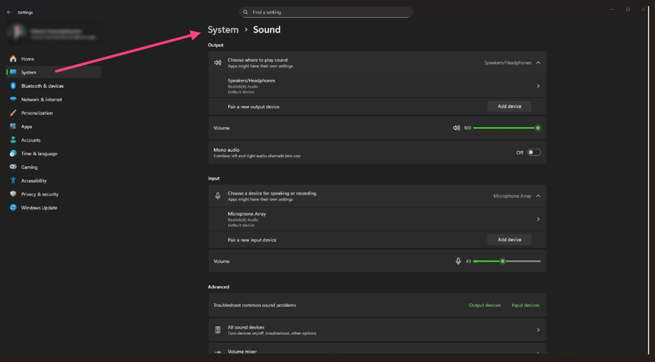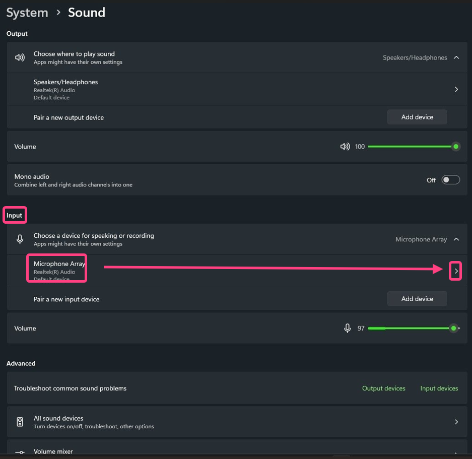 Inputsection, select the required microphone, if there are several, and clickDevice properties.
