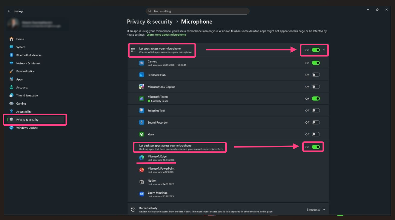 Start→Privacy & security→Microphone.- Enable microphone access for apps.