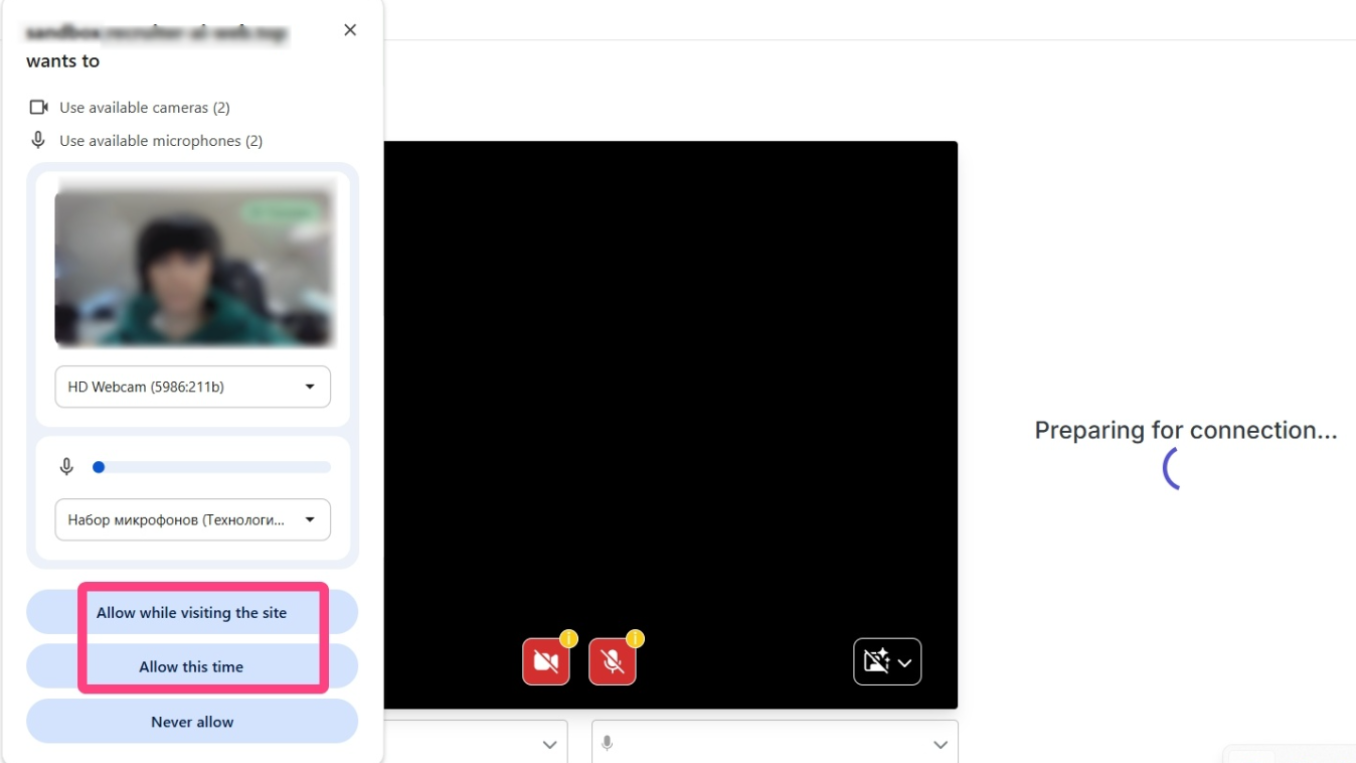 - The system will request access to the camera and microphone. Click Allow.