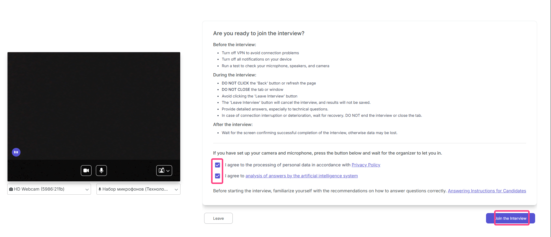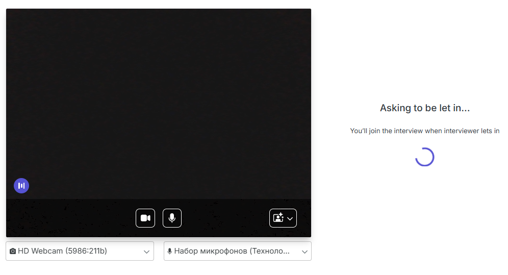 Important: The candidate receives a unique link from the interviewer to join the video meeting through any convenient messaging service and opens it at the scheduled time.