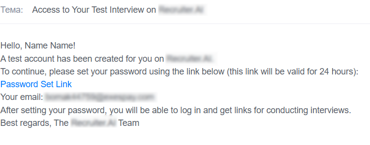 recruiter-ai@recruiter-ai.ruwith the subject “Access to your test interview on RECRUITER.AI”. - Follow the link, create a password, and the system will sign you in automatically.