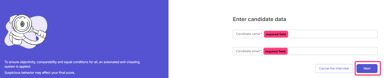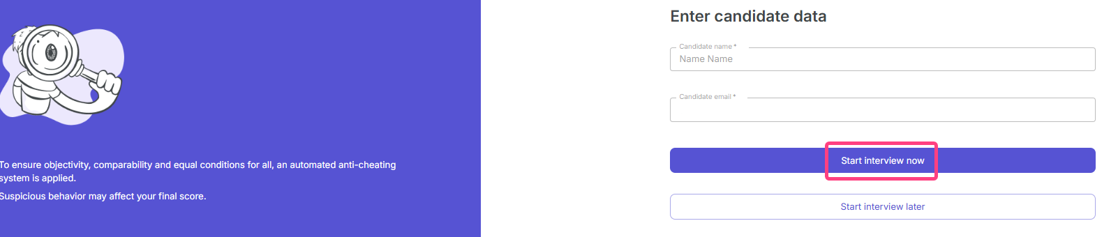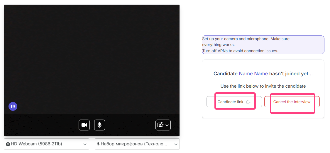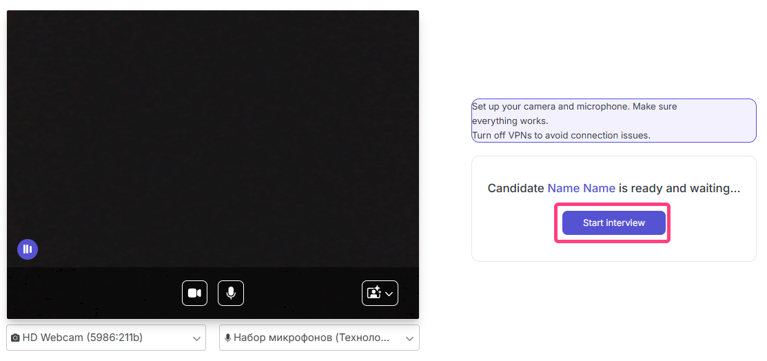 - Wait until the candidate joins the session. The status will change to “Candidate ... is ready and waiting”, and the button will change to Start interview.