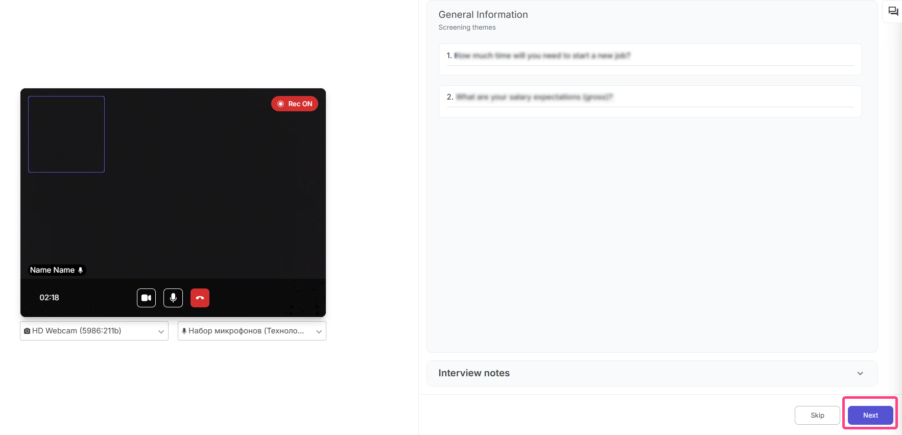 - During the process, you can add Interview notes.