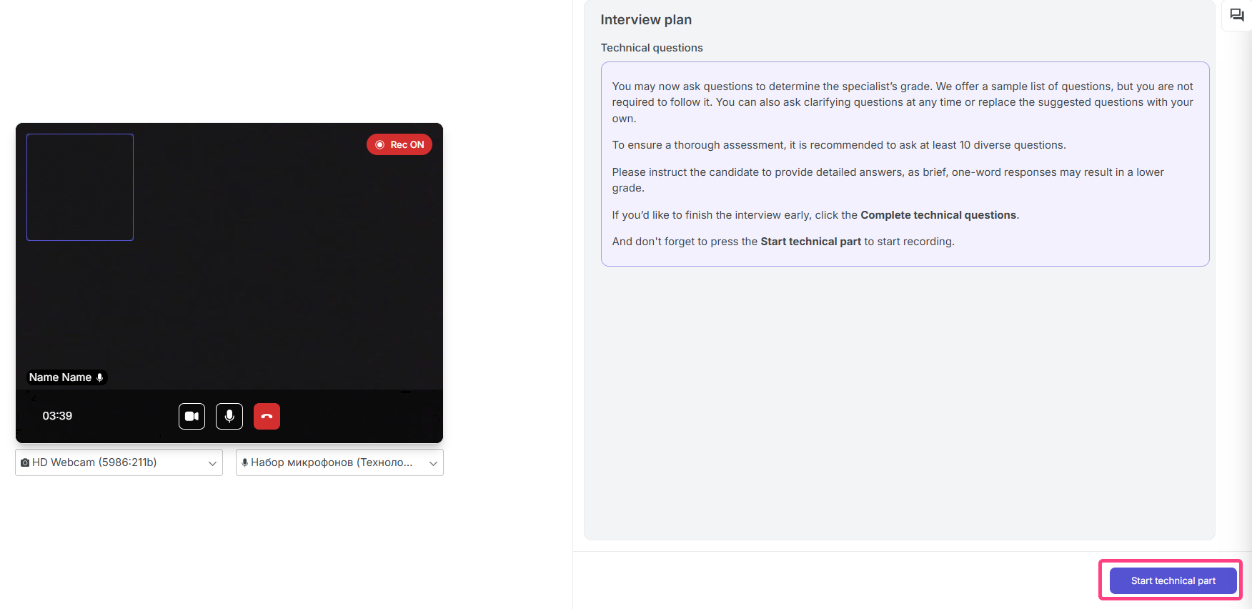 - As soon as the candidate joins, click Start interview.