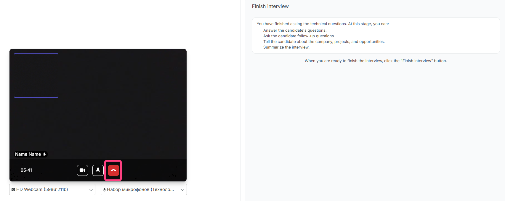 - After all technical questions are completed, the Finish interview stage will open. Here you can answer the candidate’s questions, talk about the company, and summarize the meeting.