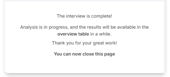 - A final confirmation modal window will appear: “Interview completed. Thank you for your time. You can view the interview results here.”