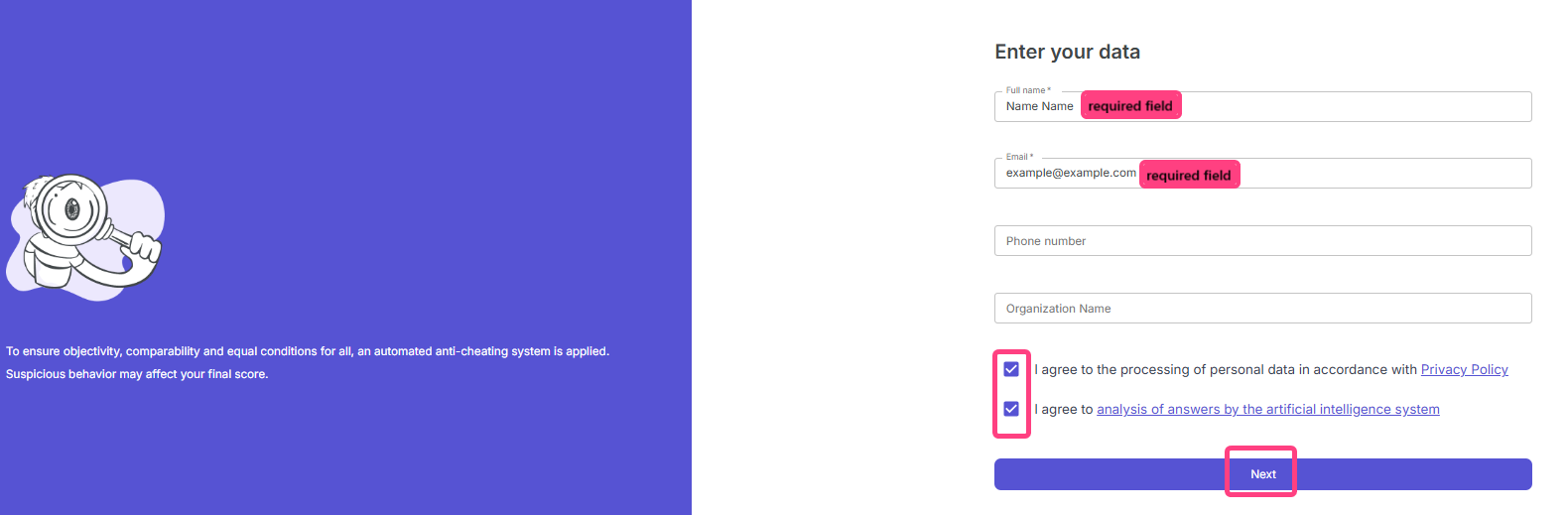 If you want not only to complete self-assessments, but also to conduct interviews with candidates, create campaigns, and manage the hiring process, you need to register in the system as a recruiter.